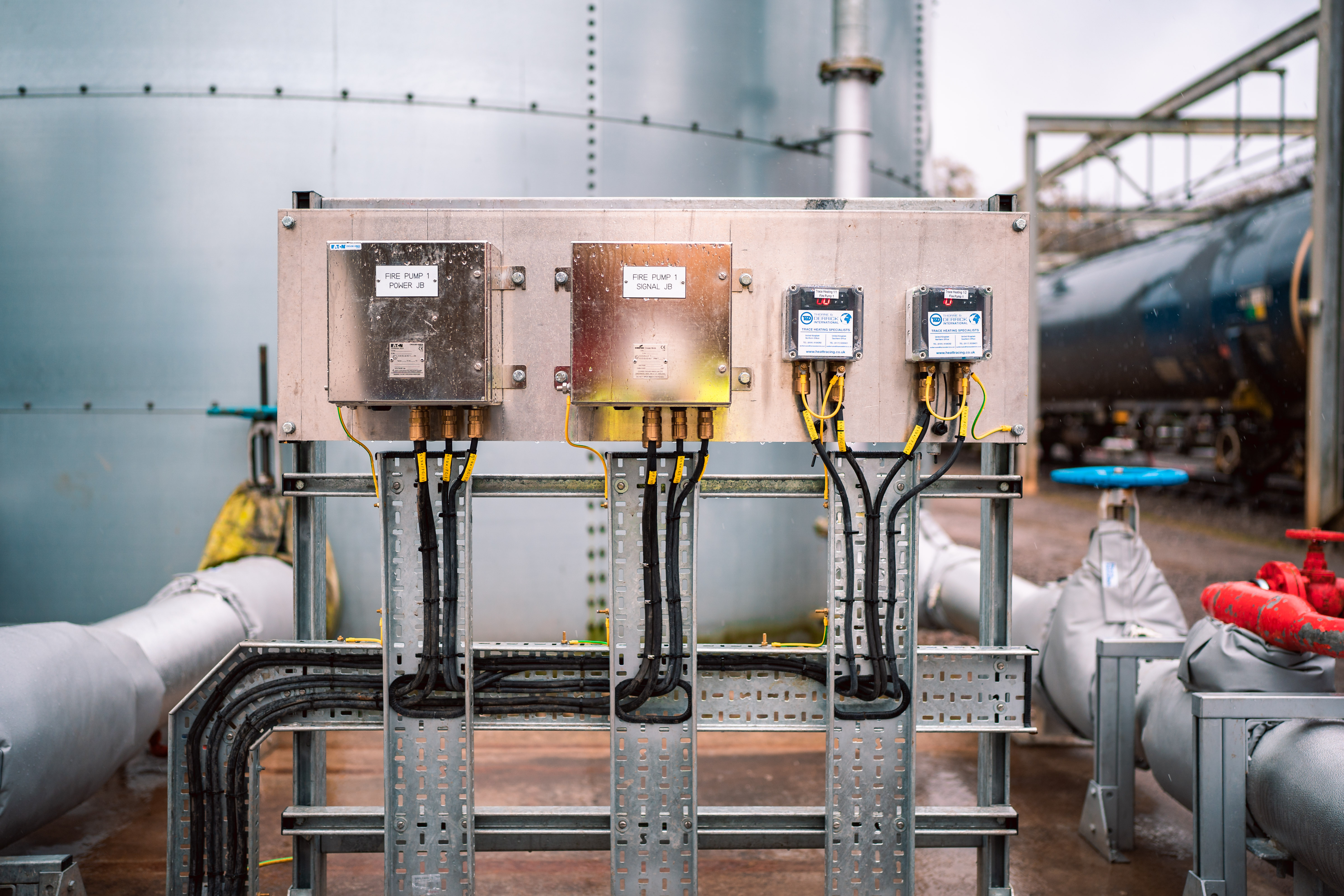 From an outline design concept from the client, we developed the design to adhere to practical requirement and logistical needs for the project. A dry ring main was installed surrounding each of the oil storage tanks, providing protection in the event of a fire. This installation then interlinks with an automatic fire alarm system as well as additional controls that form the interface operators can use to manage the environment.
